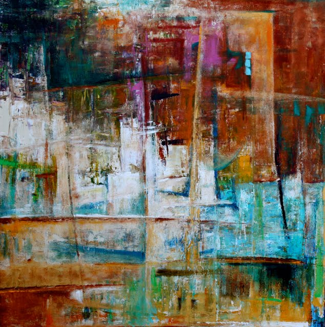 This painting began as a palette knife painting a lot like a previous painting of mine titled "Merge". I studied it for several days before I went back in, this time with a roller and worked in the horizontals and verticals. It was also painted with the bottom being the top, but then liked this viewpoint much better. "Merge" was inspired by a travel show I had seen on T.V of Greece. Guess I was in my Mediterranean mood again!
